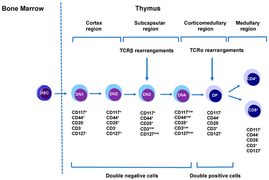 T cell development and maturation. T cells originate from hematopoietic stem cells in the bone marrow. These cells then migrate to thymus where they first develop into double-negative thymocytes (DN1-DN4). These thymocytes can be differentiated based on CD117, CD44, CD25, CD3, and CD 127 markers. DN4 then differentiates into double-positive (DP, CD4+CD8+) thymocytes after pre-TCR signaling. These DP’s differentiate into single-positive thymocytes as CD4+ and CD8+ cells.