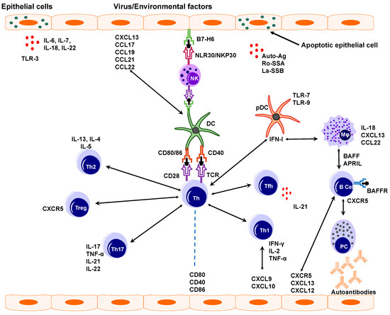 The immunohistopathological analysis showed that diseased epithelium of the salivary and lacrimal gland plays an active role in the recruitment and activation of immune cells [1,42,43,44,45,46,47]. The epithelium releases autoantigens, Ro/SSA, and La/SSB, either by exosome or by apoptosis, thus, helping in an autoimmune response [48,49]. Co-stimulatory molecules present on salivary gland epithelial cells (SGEC), such as CD80, CD86, and CD40 mediate immune response by interacting with the immune cells to produce Th1 cytokine. Thus, the epithelium of salivary glands produces various chemokines including CXCL13 (C-X-C motif ligand 13), CCL17, CCL19, CCL21, and CCL22, which help to recruit the dendritic cells to the salivary gland [50]. Other chemokines like CXCL10 and CXCL9 help in T cells homing [51] and CXCL13 might help in B cell recruitment in the salivary gland, as an increase in expression of this chemokine leads to the development of the ectopic lymphoid structure that is mainly composed of B cells [52].