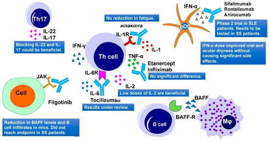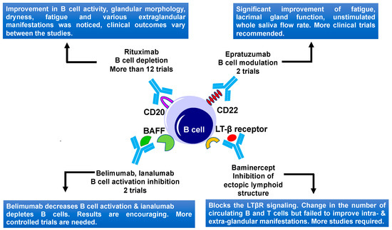 Symptomatic treatments of SS are the only treatments available thus far, no therapeutic treatment is available to cure the disease [183]. This could be due to the heterogeneity of the disease pathology. Several biological therapies reported in the literature are still in a clinical trial stage [184,185,186,187]. Among all of these therapies, B-cell-targeted therapy showed the most promising results in controlling the SS. Other therapies involving the targeting of T cells and cytokines are still in the early stages of the investigation [188]. Several diagnostic criteria of SS are reported in the literature [189]. The EULAR (see above) promoted a global collaboration to develop an SS disease activity index (ESSDAI) [190]. This activity index measures disease activity in patients with primary SS and is now used as a gold standard in clinical studies [191]. In addition, the EULAR Sjögren’s Syndrome Patient Reported Index (ESSPRI) [192], provided a questionnaire to the patients that helped to develop ESSDAI, and evaluated systemic complications [191]. Change in ESSDAI is often used as an outcome measure in clinical trials. Ocular dryness can be assessed by Schirmer tests and oral dryness through stimulated or unstimulated salivary flow rate [193]. Here, we discuss various clinical trials that showed encouraging results, and also consider some future targeting therapies for SS-related symptoms.
