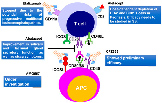 As T cell-dependent B cell hyperactivity plays a crucial role in SS pathogenesis, targeting crosstalk between T and B cells could be a successful approach to treat SS. Therefore, treatments of the early stages of SS could be more beneficial than treatments of late stages. Various T cell-targeted therapies are listed in Table 2 and Figure 6.