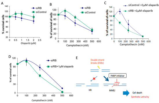 Our results showed that RB-depleted cells repair DSBs by employing the MMEJ pathway. As RB-depleted cells showed lower HR and C-NHEJ efficiencies, while the MMEJ efficiency was elevated, we hypothesized that RB-depleted cells would be more sensitive to PARP1 inhibition, and also to CPT with PARP1 inhibitor, olaparib, co-treatment, than the single CPT treatment. We found that RB knockdown led to less cell survival in response to olaparib and to camptothecin (Figure 4A,B). This result is consistent with a previous study [23]. In addition, our results demonstrated a synthetic lethality in RB-depleted cells in response to olaparib and CPT co-treatment. After inducing DSBs with CPT, enhanced sensitivity was observed in RB knocked-down cells co-treated with CPT and olaparib, compared with the control cells (Figure 4C). Furthermore, RB knocked-down cells showed an enhanced effect in co-treatment with CPT and olaparib, compared with single treatment with CPT (Figure 4D). As resection is largely initiated in the S/G2 phase [36], PARP inhibitor could induce replication stress and accumulate cells in the S phase. Both HR and MMEJ are more active in the S phase. PARP1 has been reported to be important in resection [37]. We suggest that the synthetic lethality observed in RB-depleted cells is related to the PARP1 inhibitor interrupting the early resection event in the MMEJ pathway, so that cells have a lower DSB repair efficiency to handle the elevated level of DSBs (Figure 4E).