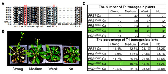 Previous studies have shown PREs as a subgroup of bHLH transcription factors that play important roles in cell elongation in response to BR, GA, temperature, and light [28,32,37,38,39]. To explore the function of PRE1 in regulating cell elongation, we conducted a phosphorylation modification survey of PREs in the published phosphorylation datasets [50]. PRE1 was found to be phosphorylated at two conserved serines, Ser-46 and Ser-67 (Figure 1A). To understand the effects of these two phosphorylation sites on the function of PRE1, Ser-46 and Ser-67 of PRE1 were mutated to glutamic acid to mimic phosphorylation at the serine residue (PRE1S46E and PRE1S67E) or to alanine to prevent potential phosphorylation (PRE1S46A and PRE1S67A). We then generated transgenic Arabidopsis plants expressing PRE1, PRE1S46A, PRE1S46E, PRE1S67A, and PRE1S67A driven by the constitutive 35S promoter. Nearly 100 T1 plants for each construct were used to analyze the growth phenotypes. According to the petiole length of the fifth leaf, we classified the transgenic plants into four categories, as follows: similar to wild type (no phenotype), weak phenotype, middle phenotype, and strong phenotype. As shown in Figure 1B,C, mutations of Ser-46 to Ala-46 or Glu-46 had no effects on the phenotypes caused by the overexpression of PRE1, indicating that Ser-46 of PRE1 is not important for PRE1 function. The phenotype of the mutation of Ser-67 to Ala-67 is similar to that of the PRE1 overexpression. However, the overexpression of PRE1S67E reduced the ratio of plants showing long petiole phenotypes and increased the ratio with no phenotype. These results indicate that phosphorylation at Ser-67 is very important for the function of PRE1.