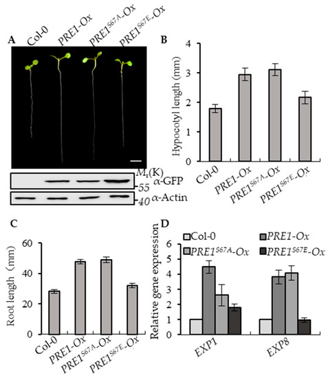 To determine the effects of Ser-67-mediated phosphorylation on the functions of PRE1, the transgenic plants of PRE1-Ox, PRE1S67A-Ox, and PRE1S67E-Ox with similar protein levels of PRE1, PRE1S67A, and PRE1S67E were selected for systemic analysis of the growth of the phenotype (Figure 2A and Figure S1A). The overexpression of PRE1 and PRE1S67A both showed a longer hypocotyl and longer root compared with the wild type, whereas the overexpression of PRE1S67E displayed normal growth phenotypes similar to wild-type plants (Figure 2B,C). EXPANSIN1 (EXP1) and EXPANSIN8 (EXP8) are two genes encoding the cell wall proteins that loosen the cell wall [51]. The quantitative RT-PCR analysis showed that the expression levels of EXP1 and EXP8 were increased in PRE1-Ox and PRE1S67A-Ox plants compared with that in the wild-type plants but were less increased in PRE1S67E-Ox (Figure 2D). Together, these results indicate that the phosphorylation at the Ser-67 of PRE1 negatively regulates its functions.
