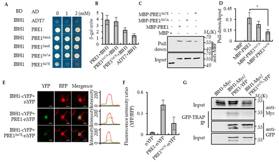 Previous studies have shown that PRE1 interacted with IBH1 to release the DNA-binding ability of HBI1 and to regulate the expression of the genes that are related to cell elongation downstream of multiple hormonal and environmental signals [32]. To determine whether the phosphorylation of PRE1 regulates the interaction between PRE1 and IBH1, we first analyzed the interaction between IBH1 with PRE1, PRE1S46A, PRE1S46E, PRE1S67A, and PRE1S67E using the yeast two-hybrid assays. Consistent with previous reports, IBH1 interacted with PRE1 in yeast. The mutation of Ser-46 of PRE1 to Ala-46 or Glu-46 and Ser-67 of PRE1 to Ala-67 all had no significant effects on the interaction between PRE1 and IBH1, whereas the mutation of Ser-67 of PRE1 to Glu-67 significantly reduced the interaction between PRE1 and IBH1 (Figure 3A,B). The in vitro pull-down assays showed that maltose-binding protein (MBP)-PRE1, MBP-PRE1S67A, and MBP-PRE1S67E were specifically pulled down by glutathione S-transferase (GST)-IBH1, but the pull-down efficient ratio of MBP-PRE1S67E was evidently lower than that of MBP-PRE1S67A (Figure 3C,D). A newly developed Ratiometric Bimolecular Fluorescence Complementation (rBiFC) assay was performed to confirm the interaction between IBH1 and the mutations of PRE1 in vivo. PRE1 or PRE1S67E and IBH1 were synchronously cloned into a single vector backbone, including a monomeric red fluorescent protein as an internal marker for the expression control and ratiometric analysis. In agreement with previous results, PRE1 interacted with IBH1 in the epidermal cells of the tobacco leaves, but the co-expression of PRE1S67E and IBH1 resulted in very weak signals (Figure 3E,F). We further tested the interaction between PRE1 or PRE1S67E and IBH1 in plants using coimmunoprecipitation assays. The results showed that PRE1 interacted with IBH1 in plants, while the mutation of Ser-67 to Glu-67 significantly reduced the interaction of PRE1 with IBH1 (Figure 3G). Together, these results strongly demonstrated that the phosphorylation at Ser-67 of PRE1 inhibited its interaction with IBH1.