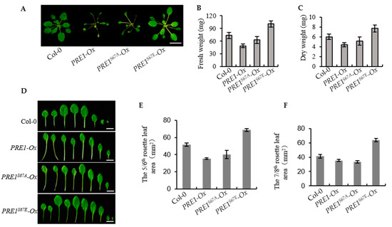The overexpression of PRE1 promoted the elongation of the hypocotyl, but the PRE1-Ox transgenic plant displayed elongated petioles, light-green, and narrow leaves, and a significantly reduced biomass. Therefore, the over expression of PRE1 did not actually play a promoting role in the biomass of the plants. The phenotype of the overexpression of PRE1S67A was similar with that of PRE1-Ox. However, we found that the phenotype of the overexpression of PRE1S67E resulted in slightly longer petioles and round leaves, as with the wild type (Col-0; Figure 6A). To further understand the biological production of these transgenic plants, we studied the fresh and dry weights of the transgenic plants that grew in the soil for weeks. The results showed that the fresh weight and dry weights of PRE167E-Ox were evidently higher than the wild type but that of PRE1-Ox and PRE167A-Ox were lower than the wild type (Figure 6B,C). This result indicates that the overexpression of PRE1S67E was significantly increased in the biomass. Figure 6D shows that the leaves of PRE167E-Ox were both larger and more than those of the wild type, PRE1-Ox, and PRE167A-Ox. In order to obtain more accurate results, we analyzed the leaf area of the fifth/sixth and seventh/eighth true leaves. The results show that the leaf areas of the fifth/sixth and seventh/eighth true leaves of PRE167E-Ox were significantly higher than those of the wild-type models, while those of PRE1-Ox and PRE167A-Ox were significantly lower than those of the wild type (Figure 6E,F). These results indicate that the overexpression of PRE1S67E is very useful for increasing crop yields.