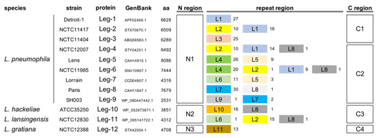 Modularity of Legionella repeats-in-toxins (RTX) proteins. The organization of the RTX proteins encoded by L. pneumophila and other Legionella species is diagrammed. N regions, C regions, and L repeats exhibiting >70% sequence identity have the same number. Repeat types are distinguished by color, with their copy numbers shown to the right. Protein modules were not drawn to scale.