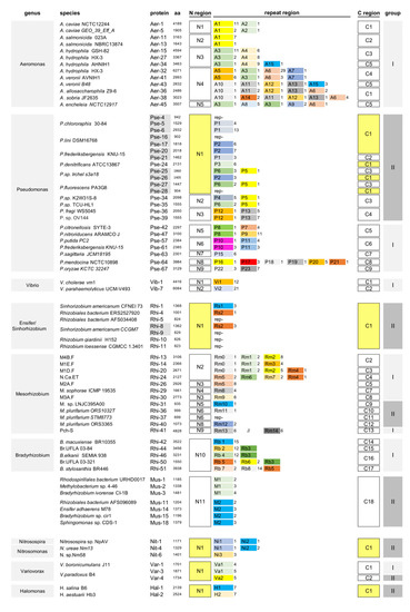 Proteins from the Bradyrhizobium genus have the same N region, but different C regions. Except Rhi-50, all Bradyrhizobium are greater than 3000 aa, each featuring a long cluster of a specific repeat type.