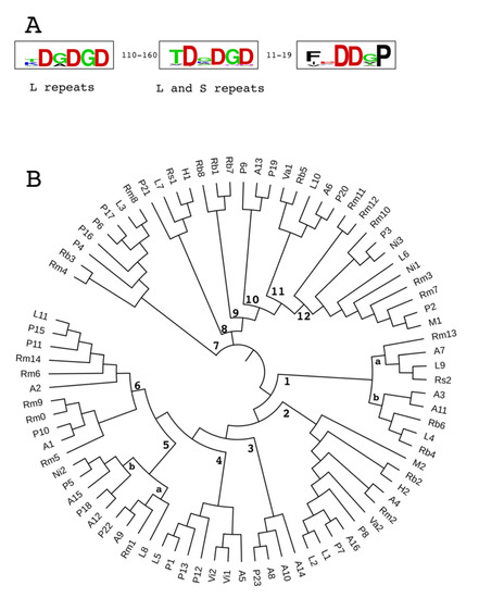 DDxP repeats. (A) Signatures of repeats. Conserved sequence motifs in short (S) and long (L) repeats are highlighted by WebLogo alignments. The number of amino acids between repeat motifs is shown. (B) Phylogenetic tree. The 85 DDxP repeats described in this work were aligned in a circular tree at the Interactive Tree Of Life (iTOL) site (https://itol.embl.de).