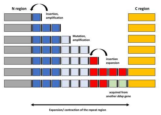 The repeat regions of DDxP proteins are highly variable. A few proteins feature one module, while most feature two or more. Steps in the formation and modification of the repeat regions in ddxp genes are summarized in Figure 5.