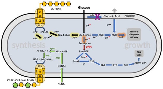 The metabolic pathway to bacterial cellulose biosynthesis in Komagataeibacter and example metabolic engineering interventions made in key papers. Native pathways from glucose to central carbon metabolism (growth) are shown as blue arrows. The native pathway to cellulose biosynthesis via the BcsABCD machinery (synthesis) is shown as black arrows. Heterologous expression of a 3-gene GlcNAc utilization pathway by Yadav et al. to produce chitin-cellulose co-polymers is shown as green arrows [22]. Interventions made by Gwon et al. to boost cellulose production are indicated in red; red arrow shows insertion of a pfkA enzyme, red asterisks show altered regulation of these genes via overexpression of the cAMP receptor protein (CRP) regulator [24]. Interventions made by Hur et al. to boost cellulose production are highlighted in yellow: expression of enzymes encoded by the galU, ndp and pgm genes are optimized by RBS tuning [25]. Interventions made by Jang et al. are highlighted in orange: heterologous expression is used to boost enzyme levels encoded by pgi and gnd [26]. Genomic deletion of the gdh gene by Liu et al. to reduce gluconic acid bi-product formation is shown as a purple X [27]. Metabolite abbreviations; Glu-6-phos: glucose-6-phosphate; 6PGL: 6-phosphogluconolactone; 6PGC: 6-phosphogluconate; Fru-6-phos: fructose-6-phosphate; Fru-1-6P: fructose-1,6-diphosphate; DHAP: dihydroxyacetone phosphate; G3P: glyceraldehyde-3-phosphate; 2PG: 2-phosphoglyceric acid; PEP: phosphoenol pyruvate; PYR: pyruvate; Glu-1-phos: glucose-1-phosphate; UTP: uridine triphosphate; UDP: uridine diphosphate. UDP-Glu: UDP-glucose; GlcNac: N-acetylglucosamine; GlcNAc-1P: N-acetylglucosamine-1-phosphate; GlcNAc-6P: N-acetylglucosamine-6-phosphate; UDP-GlcNAc: UDP-N-acetylglucosamine.