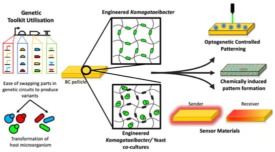- Walker, K.T.; Goosens, V.J.; Das, A.; Graham, A.E.; Ellis, T. Engineered cell-to-cell signalling within growing bacterial cellulose pellicles. Microb. Biotechnol. 2019, 12, 611–619. [Google Scholar] [CrossRef] [PubMed]