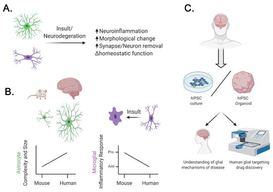 Bimodal role of glia in neurodegeneration and differences between human and mouse glia. (A) Both astrocytes and microglia are poised to be critical players during neural insult due to their close association and interactions with neurons. Thus, during a neurodegeneration, there is an interplay between reduction in homeostatic functions and participation in neuroinflammatory response. Loss of regular homeostatic functions of glia, including reduced regulation of ion and neurotransmitter concentration in the extracellular space as well as reduced secretion of neurotrophic factors, can promote disease pathogenesis, while compensatory increase in these functions can delay disease onset. Neuroinflammation in glia alters their morphology and increases secretion of pro- and anti- inflammatory cytokines and participation in removal of damaged synapses and neurons. While initially this may be beneficial, chronic neuroinflammation seems to be harmful. (B) Humans and mice differ in the complexity of astrocyte processes, which is increased in humans relative to mice (left), and in microglial neuroinflammatory response to secreted molecules, which is decreased in humans (right). (C) Patient-derived human-induced pluripotent stem cells (iPSCs) can be used to study the cellular and molecular processes contributing to glial changes in neurodegenerative diseases as well as for high-throughput testing of potential drugs. Created with BioRender.com.