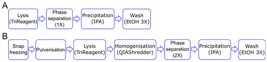 Schematic of RNA isolation steps. (A) For the 2D culture, the cell lysis in the TRI Reagent is followed by phase separation and RNA precipitation using isopropanol alcohol (IPA). (B) For the 3D culture, the samples are snap frozen and pulverized before the lysis step. The lysate is homogenized and then subject to two rounds of phase separation before proceeding with the RNA precipitation step. In both cases, RNA is washed three times using 70% ethanol (EtOH).