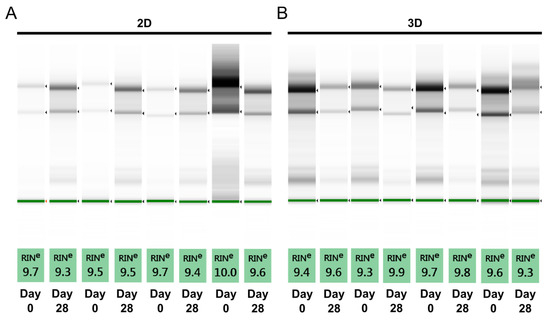 Assessment of RNA quality using RNA integrity number (RIN) equivalent. RNA integrity number is assigned as equivalent RIN using a 2200 TapeStation system. (A) One representative sample from each donor in 2D culture; and (B) one representative sample from each donor in 3D culture for a total of four donor per each culture type.