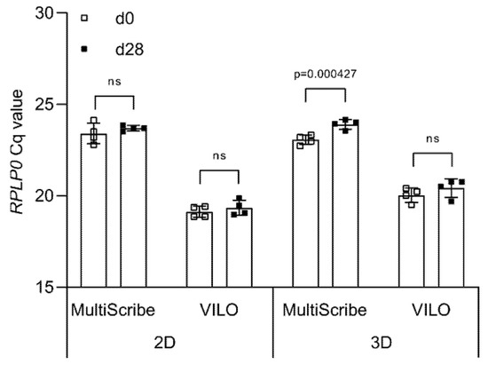 In 2D, no statistically significant differences are seen between day 0 (23.39 ± 0.47) and day 28 (23.73 ± 0.33) when using MultiScribe™ (Figure 3). The same is observed for the Cq values obtained when using SuperScript™ VILO™, although the values are lower both at day 0 (19.16 ± 0.39) and at day 28 (19.40 ± 0.40). In 3D, we detect a statistically significant difference between the Cq values at day 0 (23.18 ± 0.31) and day 28 (24.03 ± 0.15) when using MultiScribe™ to obtain cDNA (p = 0.000427). The use of SuperScript™ VILO™ reduces the difference in Cq between time points from ΔCq = 0.86 to ΔCq = 0.39, and no statistically significant difference is calculated. As for the 2D, also in 3D the Cq values of RPLP0 are lower (overall mean 20.23 ± 0.49) when using SuperScript™ VILO™ compared to MultiScribe™ (23.61 ± 0.50).