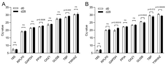 The Cq values of the candidate reference genes range from a minimum Cq value of 7.43 and 7.03 obtained with 18S to a maximum of 30.46 and 30.00 for YWHAZ, in 2D and 3D culture, respectively (Figure 4). In 2D, PPIA and TBP are the only two reference genes that show a statistically significant difference between day 0 and day 28 of culture (p ≤ 0.0008 and p ≤ 0.022, respectively) (Figure 4A). In 3D, TBP has different Cq values between the two time points as well as GAPDH, GUSB, and YWHAZ. On the contrary, PPIA is stable between time points together with 18S and OAZ1 (Figure 4B).