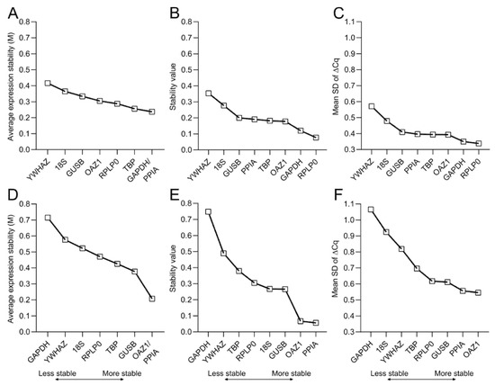 Another approach to identify the most stable reference gene is developed by Silver et al. [24]. With this method, the Cq value of pairs of reference genes within a sample is compared by first calculating the mean ΔCq value of each possible combination of pairs of genes and then the SD of the ΔCq (Table A1). The candidate reference genes are then ranked according to the calculated mean SD.
