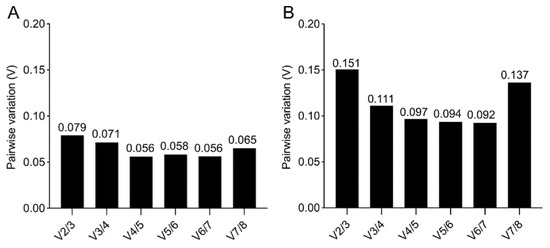 The Cq values of candidate reference genes are transformed by applying the method, where the lowest Cq value is used as a reference. Obtained values are loaded into geNorm v. 3.5 Visual Basic Application for Microsoft Excel. A stability value (M) was computed for all candidate reference genes through a pairwise comparison. Step by step, the highest stability value was excluded, and the average expression stability was recalculated, thereby enabling the ranking of reference genes from the lowest stability value to the most stable combination of reference genes. Furthermore, geNorm suggests the optimal number of reference genes based on the calculation of a new normalization factor () on each occasion when the next stable reference gene is added. Between the sequential normalization factors, according to the descending stability values the pairwise variation was then calculated. If the pairwise variation is ≥0.15 when including the (n + 1) gene, the addition of that reference gene has a significant effect [22].