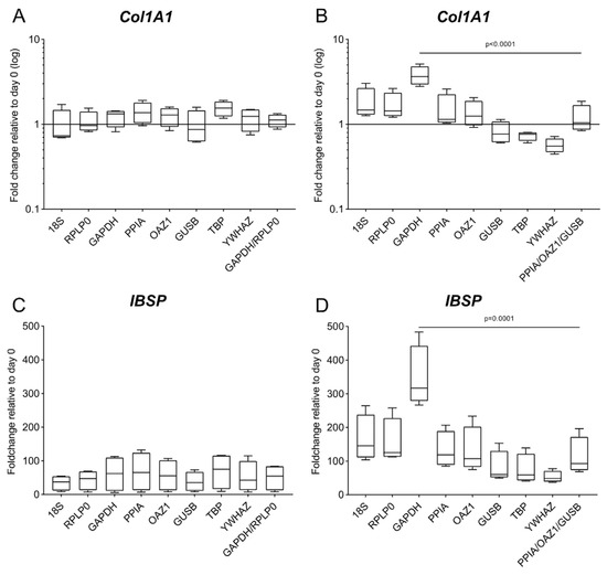 For both culture types, the expression of both Col1A1 and IBSP is affected by the chosen reference gene (Figure 7), in particular for the 3D culture, where the fold change of Col1A1 has opposite trends and IBSP has a fold change varying between 52.9 and 345.87 depending on the choice of reference gene. Based on the results of the comprehensive ranking, we use the geometric mean of the two (GAPDH/RPLP0, for 2D) or three (PPIA/OAZ1/GUSB, for 3D) reference genes with the lowest mean of all stability values for the analysis of the target genes [22]. When compared to data obtained using the worst-performing reference gene (YWHAZ in 2D and GAPDH in 3D), a statistically significant difference is detected only for the 3D culture (p < 0.0001 for Col1A1 and p = 0.0001 for IBSP) (Figure 7B,D).