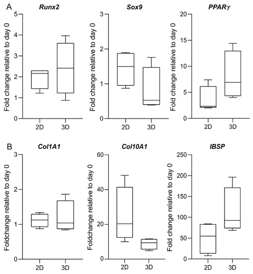 Consistent with cells in a monolayer, we observe an increased expression of the late-stage osteogenic marker IBSP at day 28, confirming the osteogenic commitment of the cells in 3D cultures of MeHA hydrogels (Figure 8). The expression at the mRNA level of all the genes under investigation is comparable between the 2D and the 3D culture. No statistical significance can be identified between the 2D and the 3D culture in the fold changes of the target genes. However, when compared to osteogenic 2D culture, there is a clear trend for cells within MeHA to express lower levels of Sox9 and Co10A1 and increased levels of PPARγ and IBSP.