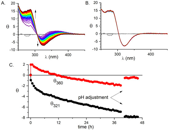 The formation of the 1:1 Pd(II) complex of A monitored by CD. (A) The 40 h evolution of CD spectra of the sample containing 0.3 mM A and 0.255 mM at pH 4.0 and room temperature. (B) The six-hour evolution of CD spectra of the same sample after the change of pH to 6.5. (C) The time dependence of ellipticity at 360 and 321 nm.