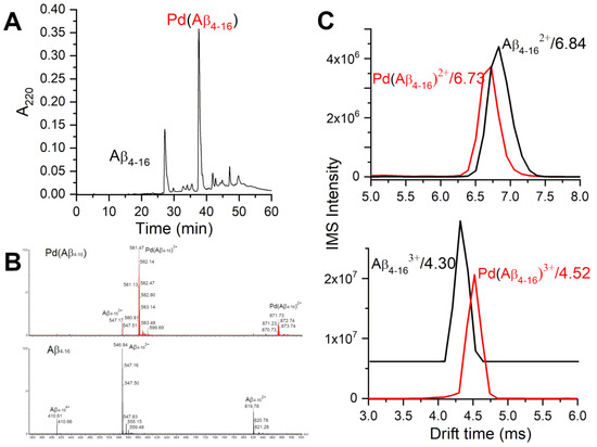 HPLC/MS characterization of products of the two-step procedure of obtaining the Pd(A) samples. (A) HPLC chromatogram of the sample containing initially 0.5 mM A and 0.425 mM KPdCl. (B) ESI-MS spectra of the respective HPLC peaks. (C) IMS characterization of A and Pd(A) species at pH 6.5.