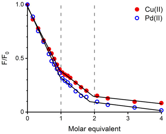 The next experiment compared the effect of Pd(II) and Cu(II) ions on Tyr10 fluorescence, a common tool in studying metal binding to A peptide [11,16]. In order to maintain a coherence between the Pd(II) and Cu(II) complexes, the samples were prepared in a different way. The required aliquots of stock solutions of Cu(II) salt were added directly to individual 25 M A samples dissolved in 20 mM MES buffer at pH 6.5, or 20 mM HEPES at pH 7.4. The Pd(II) samples were prepared using a two-step procedure: initially, appropriate Pd(II) solutions with A peptide were prepared in water, at pH 4, and incubated for 48 h. Next, the appropriate buffer was added to achieve a final solution with 20 mM MES, pH 6.5, or 20 mM HEPES, pH 7.4. The resulting titration curves, either for pH 6.5 (Figure 3) and 7.4 (Figure S1) indicate that both metal ions quench Tyr10 fluorescence in a similar stepwise manner. The straight lines in Figure 3 and Figure S1 are linear fits to the titration curve segments corresponding to the binding of the metal ions at the 1st and 2nd binding sites, demonstrated for Cu(II) ions [16], and presumably equally valid for Pd(II).