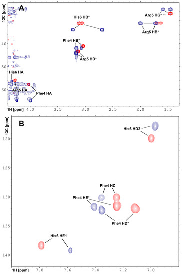 These observations prompted the NMR study of the structure and dynamics of the Pd(A) complex. However, while the observations presented above strongly suggested that the Pd(II) ion was bound selectively at the ATCUN/NTS Phe4-Arg5-His6 sequence, some binding at His13 and/or His14 residues could not be excluded a priori. Therefore, structural experiments were also performed using the Phe-Arg-His-amide tripeptide. This peptide has essentially one possible Pd(II) binding mode at weakly acidic pH, namely the ATCUN/NTS four-nitrogen complex, as evidenced by the X-ray study of its analogue Gly-Gly-His [33]. It could, therefore, serve as a positive control for the A experiments. The analysis of NMR spectra of the tripeptide complex, presented in Figure 4 and Figure S3 confirmed the expected coordination mode. Very interestingly, the Pd(II) complexation did not affect the dynamics of the Phe4 side chain, but significantly elevated the longitudinal and decreased the transverse C relaxation rates for the His imidazole ring. This observation is in line with the formation of the six-membered chelate ring formed by simultaneous coordination of His amide and His N1 nitrogens.