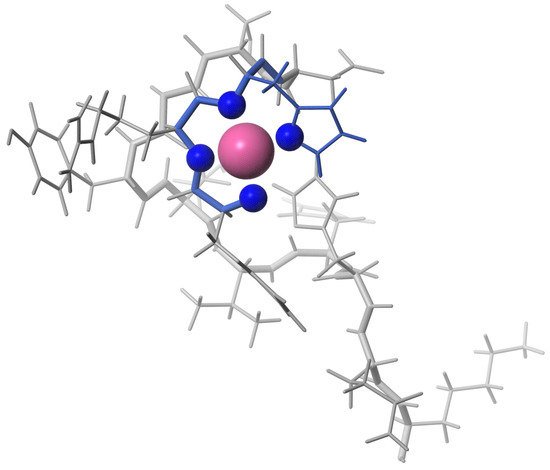 Diffusion experiments were carried out on a Varian Inova 500 NMR spectrometer utilizing a standard PGSE (Pulsed Gradient Spin Echo) pulse sequence [56] supplemented with Excitation sculpting Solvent Suppression block [57] were applied as 25 gradients with an effective gradient pulse duration () as long as 3 ms. The diffusion measurements for A saturated with Pd(II) were performed using diffusion time () of 100 and 150 ms in the case of Pd(II) concentrations 1 and 1.4. The 128 accumulations were performed with a relaxation delay of 3 s in order to increase the signal-to-noise ratio. The obtained experimental data were Fourier transformed with a 2 Hz line broadening factor applied. For extraction of the translation diffusion coefficient (), the signals observed between 0–3 ppm were integrated and then exported to the Origin software together with gradient amplitudes. The values were extracted by fitting using the Stejskal–Tanner equation [42] taking into account an additional correction for the delay during BPP pulse in sequence (delay between gradient and pulse was equal to 0.5 ms).