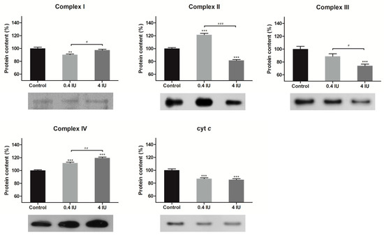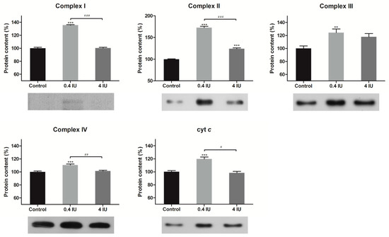 Effects of acute insulin treatment on the expression of electron transport chain (ETC) complexes and cyt c in mitochondria-enriched fractions (MEF). Protein content is expressed relative to controls, which were standardized to 100%. Mean ± SEM values are averages of three independent experiments performed in triplicate (pooled from six animals in each group). A representative blot is shown. Volume is the sum of all pixel intensities within a band (1 pixel = 0.007744 mm2). * compared to control: ** p ≤ 0.01, *** p ≤ 0.001; # 0.4 IU vs. 4 IU: # p ≤ 0.05, ## p ≤ 0.01, ### p ≤ 0.001.