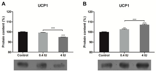 Effects of acute (A) and chronic (B) insulin treatment on the expression of uncoupling protein (UCP) 1 in MEF. Protein content is expressed relative to controls, which were standardized to 100%. Mean ± SEM values are averages of three independent experiments performed in triplicate (pooled from six animals in each group). A representative blot is shown. Volume is the sum of all pixel intensities within a band (1 pixel = 0.007744 mm2). * compared to control: ** p ≤ 0.01, *** p ≤ 0.001; # 0.4 IU vs. 4 IU: ### p ≤ 0.001.