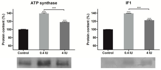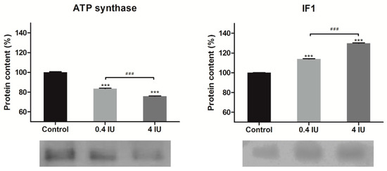 Effects of acute insulin treatment on the expression of ATP synthase and inhibitory factor 1 (IF1) in MEF. Protein content is expressed relative to controls, which were standardized to 100%. Mean ± SEM values are averages of three independent experiments performed in triplicate (pooled from six animals in each group). A representative blot is shown. Volume is the sum of all pixel intensities within a band (1 pixel = 0.007744 mm2). * compared to control: *** p ≤ 0.001; # 0.4 IU vs. 4 IU: ### p ≤ 0.001.