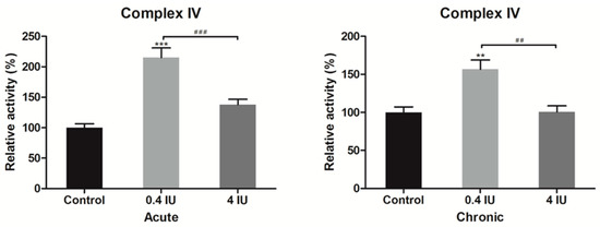 Relative complex IV activity following acute and chronic insulin treatment. Data showing complex IV activity, expressed relative to a control (taken as 100%), represent the means ± SEM values of three independent experiments. * compared to control: ** p ≤ 0.01, *** p ≤ 0.001; # 0.4 IU vs. 4 IU: ## p ≤ 0.01, ### p ≤ 0.001.