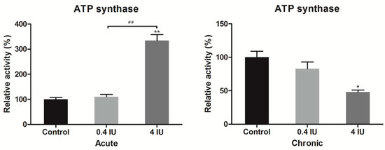 Relative ATP synthase activity following acute and chronic insulin treatment. Data showing ATP synthase activity, expressed relative to a control (taken as 100%), represent the means ± SEM values of three independent experiments. * compared to control: * p ≤ 0.05, ** p ≤ 0.01; # 0.4 IU vs. 4 IU: ## p ≤ 0.01.