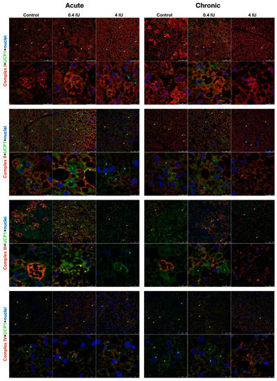 Considering these clear and prominent insulin-induced changes of bioenergetic and thermogenic proteins, we analyzed whether this effect was related to the Harlequin pattern of UCP1 localization in BAT. Therefore, cellular localization and immunoexpression of ETC complexes and UCP1 were studied by confocal microscopy following acute or chronic treatment with a low (0.4 IU) or high (4 IU) dose of insulin (Figure 9).