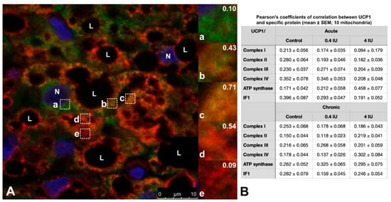 Representative images showing the Harlequin effect in brown adipocyte and the types of mitochondria. Double labeling with antibodies against UCP1 (green) and complex I (red). Nuclei were stained with Sytox Orange. (A) Representative BAT image from chronic low (0.4 IU) insulin group. Brown adipocytes showed various mitochondrial types: a. UCP1-only positive mitochondria; b. UCP1 predominantly positive mitochondria; c. UCP1 and complex I colocalized mitochondria; d. complex I predominantly positive mitochondria; e. complex I-only positive mitochondria. Pearson’s coefficient of correlation is shown in the upper right corner for each type of mitochondria. (B) Pearson’s coefficients of correlation between UCP1 and specific protein (mean ± SEM; 10 mitochondria within single brown adipocyte from each group). Scale bar = 10 µm (A).