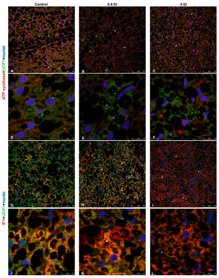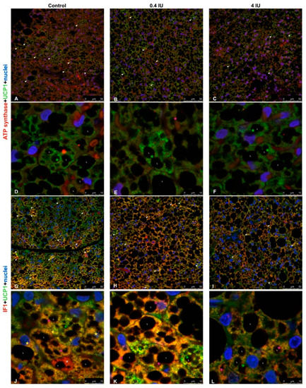 Colocalization studies using anti-UCP1 and anti-ATPase inhibitory factor 1 (IF1) primary antibodies revealed heterogeneity of UCP1 or IF1 localization brown adipocytes in the control group (Figure 11G). That randomly dispersed Harlequin pattern of UCP1 and/or IF1 positive brown adipocytes was diminished in acutely treated groups, and overall IF1 immunofluorescence was higher in the low (0.4 IU) dose group compared to the high (4 IU) dose group and control (Figure 11H,I). Preadipocytes did not show UCP1 immunofluorescence (Figure 11J), while brown adipocytes displayed a range of UCP1 and IF1 (co)localization in mitochondria (Figure 11K,L).