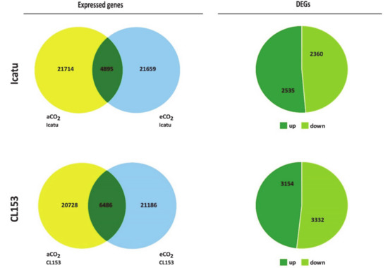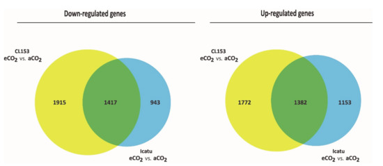 A high number of DEGs (2799) were found to be commonly expressed by the two genotypes as a response to eCO2 (Figure 2), corresponding to 57% of all DEGs in Icatu, and to 43% of DEGs in CL153.