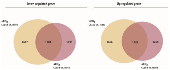 Icatu expressed a higher number of genes than CL153 at aCO2 (more 986 genes) or at eCO2 (more 473 genes; Figure 1; Table S2). Nevertheless, there was always a common response by the two genotypes, either at eCO2 or aCO2: 3451 genes (1704 down- and 1747 up-regulated) were commonly expressed between genotypes under both aCO2 and eCO2 (Figure 3). These corresponded to 51% of all DEGs found at eCO2 and to 59% of all DEGs found at aCO2, while the remaining DEGs were exclusive to only one CO2 level. Fold change values between genotypes varied from -13.36 to 14.23 under aCO2 (Table S5) and from -10.99 to 12.17 under eCO2 (Table S6).