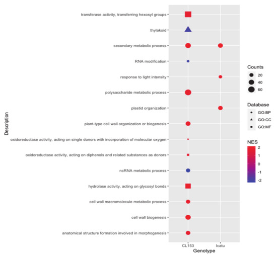 Gene Set Enrichment Analysis (GSEA) performed by WEB-based Gene SeT AnaLysis Toolkit (WebGestalt). Significantly (FDR < 0.05, p< 0.001) enriched Gene Ontology (GO) terms among down- and up-regulated differentially expressed genes (DEGs) ranked by increasing log2 fold-change (FC), considering the effect of eCO2 in CL153 (left) and Icatu (right). Gene Ontology (GO) terms are grouped by the main category – Biological Process (GO:BP), Molecular Function (GO:MF), and Cellular Component (GO:CC). Counts indicate the number of DEGs annotated with each term/pathway and dots are colored by ascending normalized enrichment score (NES).