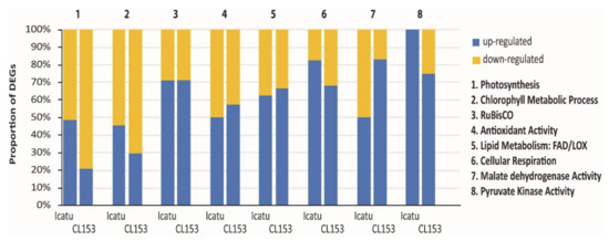 Proportion of significantly up- (blue) and down-regulated (yellow) DEGs associated to physiological and biochemical responses in coffee that were found at eCO2 vs. aCO2, in Icatu and CL153. DEGs were searched in the following GO terms: Photosynthesis, Chlorophyll Metabolic Process, RuBisCO, Antioxidant Activity, FAD and LOX (Lipid Metabolic Process), Cellular Respiration, Malate Dehydrogenase (MDH) activity, and Pyruvate Kinase (PK) activity.