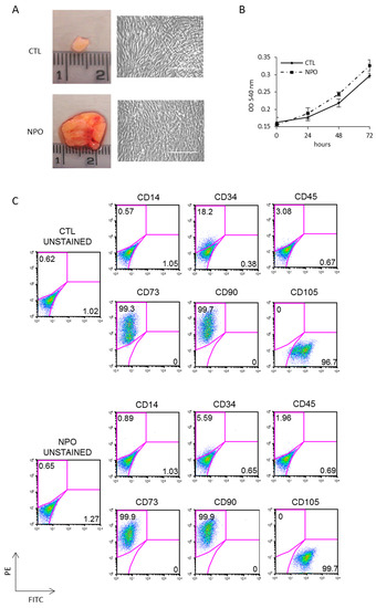 Mesenchymal stem cells derived from polyps (NPO-MSCs) meet the basic criteria for typical MSCs, including (I) adherence to plastic culture plates; (II) high expression for the cell surface markers CD90, CD73, and CD105 and the absence of MHC-II (class of major histocompatibility complex), CD45, CD34, CD14, or CD11b surface antigens; and (III) multipotential ability to differentiate toward mature osteoblasts, adipocytes, and chondroblasts in vitro [16,17,18,19,20].