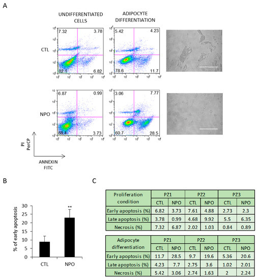 NPO-MSCs undergo apoptosis when cultured in adipocyte differentiation medium. (A) CTL-MSCs and NPO-MSCs were cultivated in either proliferation conditions (non-induced CTL) or in adipocyte differentiation medium. Images are in phase contrast and scale bar indicates 100 µm. Cells were stained for both annexin V and PI to evaluate early apoptosis, late apoptosis, and necrosis and analyzed by FACS. The results of early apoptosis are represented as means ± SD from three different experiments and (B,C) the percentage of early apoptosis and late apoptosis/necrosis are indicated in the table for each patient (** p < 0.001).
