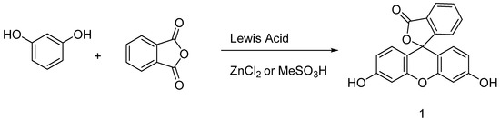 Originally obtained by condensing phtalic anhydride with phenol in acidic conditions by Von Baeyer, this preparation of fluorescein 1 is nowadays based on Friedel–Crafts reactions (Figure 3). Thus, the fluorophore can be easily obtained by mixing phtalic anhydride, resorcinol and ZnCl2 or methanesulfonic acid [18,19]. Large scale manufactured, fluorescein 1 has been included in the World Health Organization (WHO)’s model list of essential medicines [20] for its biological applications, but it is also used in other fields, such as petrochemistry for leak detection and cosmetic formulations.
