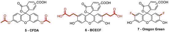 Using similar protocols based on comparison between intra and extracellular pH, bacterial life cycle can be also monitored since substrate consummation, and resulting productions of metabolites may induce variations in both environments. For example, Bouix et al. described a protocol to monitor pHin variations following the malolactic fermentation (MLF) of Oenococcus oeni in wine [95]. Using diacetate derivatives of carboxyfluorescein 3 and Oregon Green 7, pHin variations from 3 to 6 were accurately observed using flow cytometry analysis along different growth phases. It appeared that fermentation occurs during the exponential phase, where malic acid is co-excreted as lactic acid, carbon dioxide, and proton. This production induces an increase of pHin and stimulates the ATP synthase pathway. This study shows that pH monitoring using fluorescein derivatives provides valuable insights into the cellular mechanisms at play in pathogenesis.