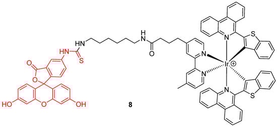 Novel chemical associations based on fluorescein 1 were recently elaborated as dyads. For example, Zhang et al. proposed a ratiometric probe based on the chemical association 8 of an iridium (III) complex with FITC 2 (Figure 8) for pHin monitoring [27]. Under a single wavelength excitation at 488 nm, ratiometric determination of pHin is possible from 5.2 to 7.8, using near infrared emission from iridium (III) complex.
