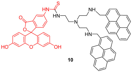 Bispyrene-Fluorescein dyad 10, as Förster resonance energy transfer (FRET) based pH-sensitive probes by Wu [48].