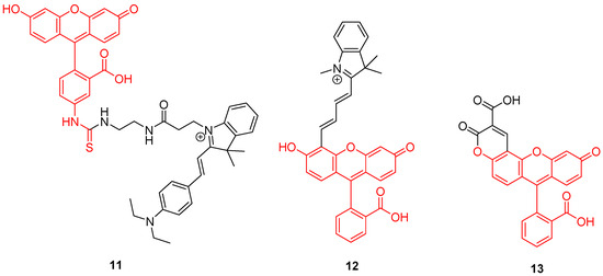 In addition to the creation of ratiometric probes, the dyads strategy can also be an opportunity to enlarge operating windows of pH-sensitivity of fluorescein. Since large pH fluctuations may occur in cells, during mitophagy for example, more accurate and wider pH-sensitive monitoring offers a better understanding of cellular life. However, the range of the pH efficient interval for fluorescein 1 is limited to 6 to 8. Therefore, Lee et al. put forward a novel dyad based on chemical association with rhodamine B (9) (Figure 9) [46]. Inspired by previous works using both compounds grafted on nanodots [47], rhodamine was covalently linked to fluorescein 1 in order to create a pH-sensitive probe efficient from 4 to 8. The widening of the pH efficient interval is based on rhodamine fluorescence, which decreases with alkalization. Moreover, both fluorophores have similar absorbance properties, offering an opportunity to use ratiometric calculation by exciting both molecules at 488 nm. Finally, the dyad was shown to be effective to determine pHin across in vitro experiments.