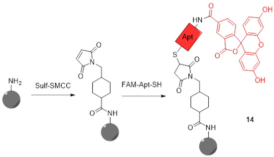 Preparation of silicon nanodots 14 bearing aptamers and FITC according to Zhang [57].