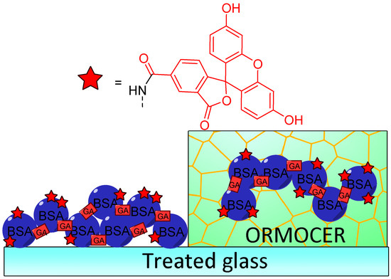 Immobilization of carboxyfluorescein (FAM)-bovine serum albumin (BSA) on treated glass by direct glutaraldehyde (GA) cross-linking or after incorporation in ORganically MOdified CERAmics (ORMOCER), according to Bidmanova [64].